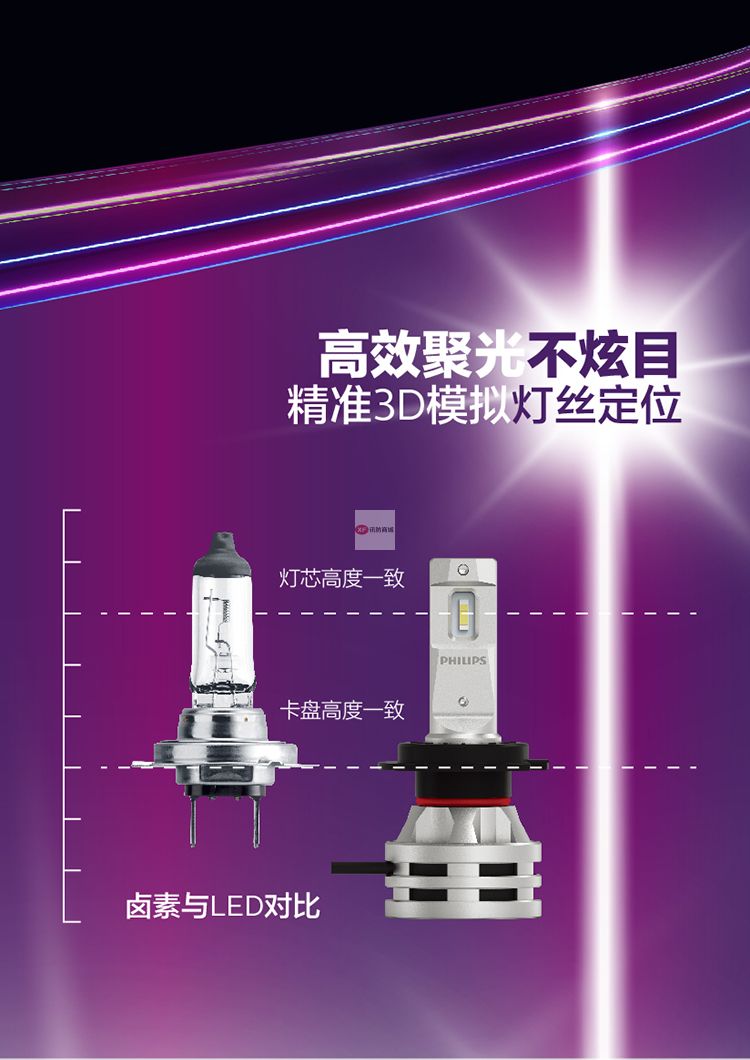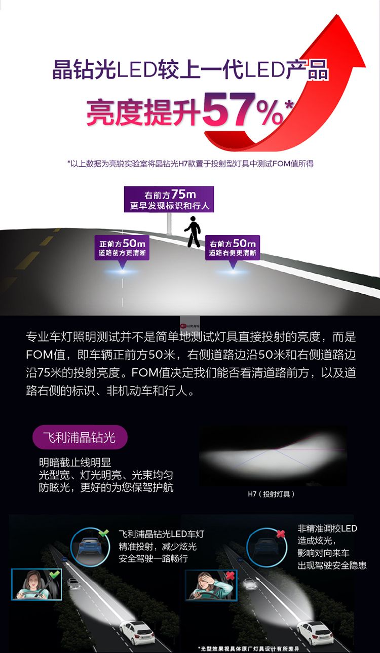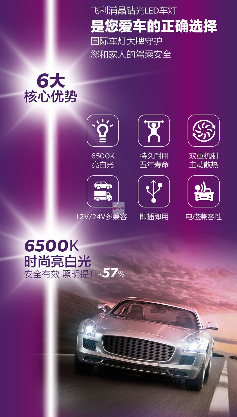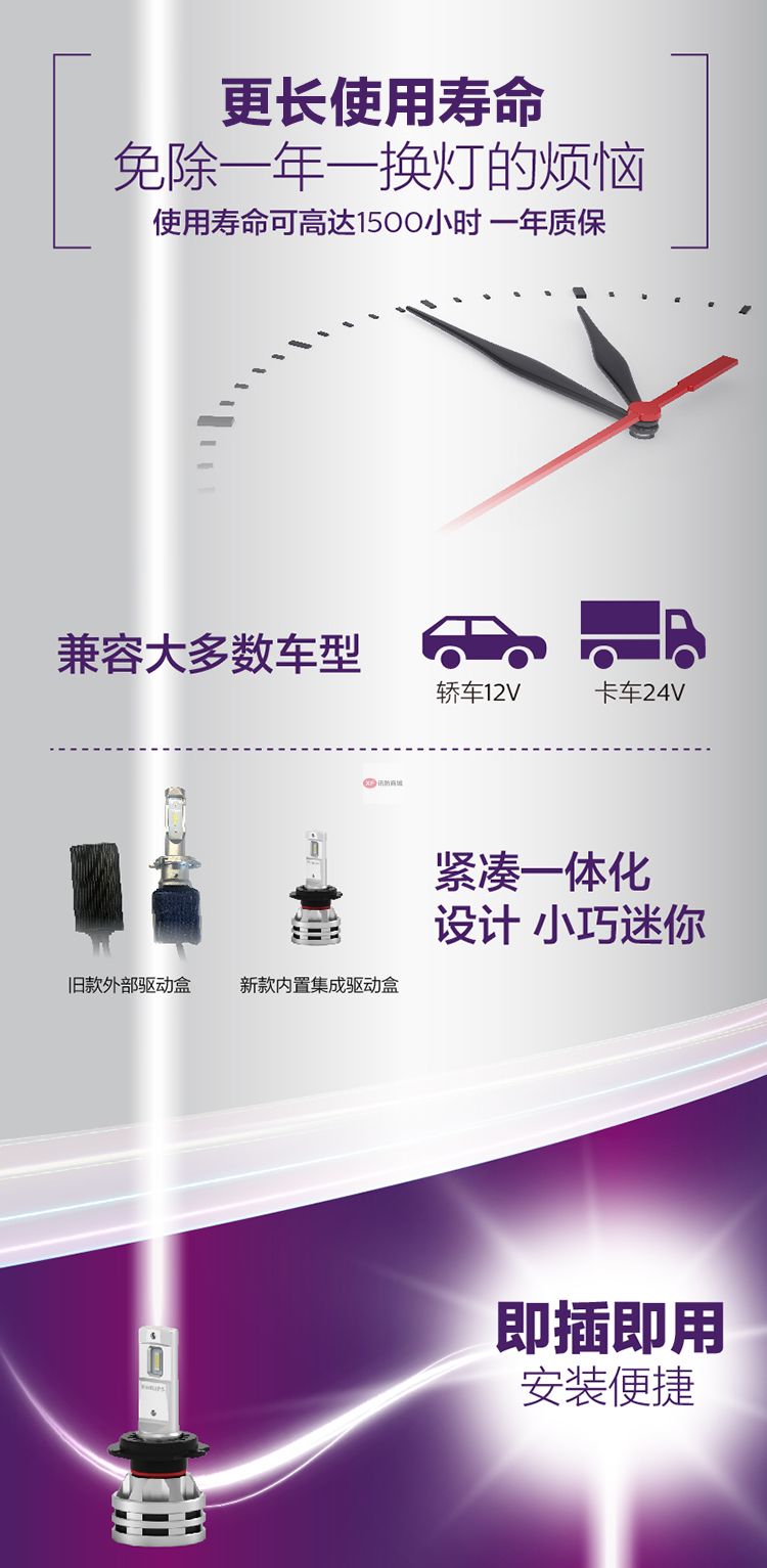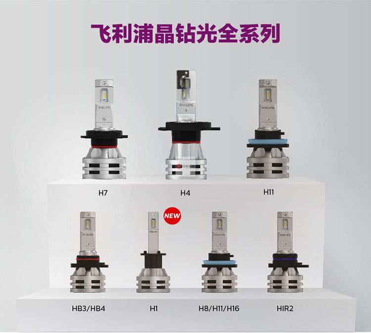自營飛利浦(PHILIPS)晶鉆光 汽車LED大燈 H7 LED汽車車燈 無損安裝遠光燈近光燈 6500K時尚白光 雙支裝
