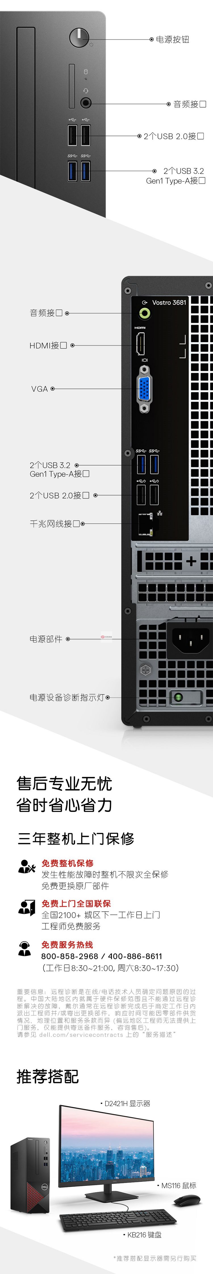 自營戴爾(DELL)成就3681英特爾酷睿i3商用辦公高性能臺式機電腦整機(十代i3-10100 8G 1T 三年上門售后)21.5英寸