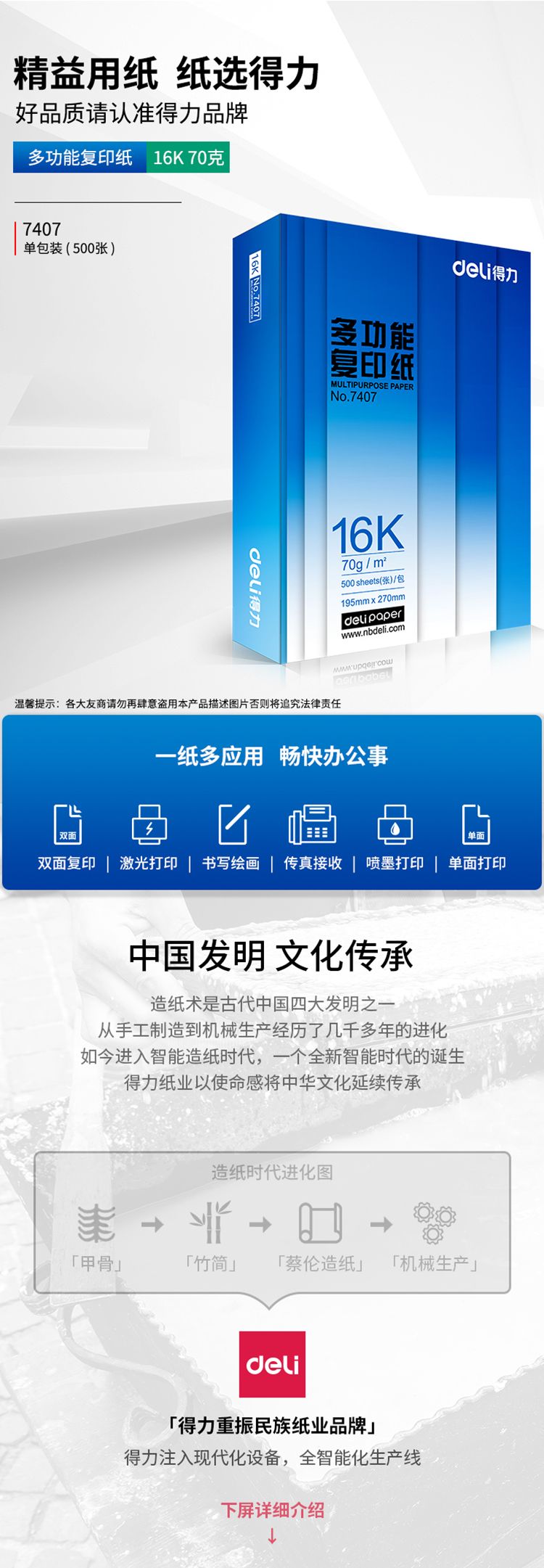 自營(yíng)得力(deli) 復(fù)印紙 7408 幅面:16K 克重:70g 包裝規(guī)格:500張/包 白色