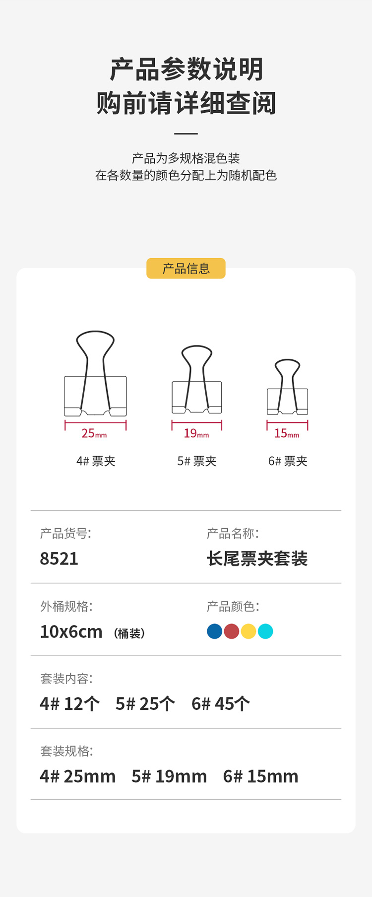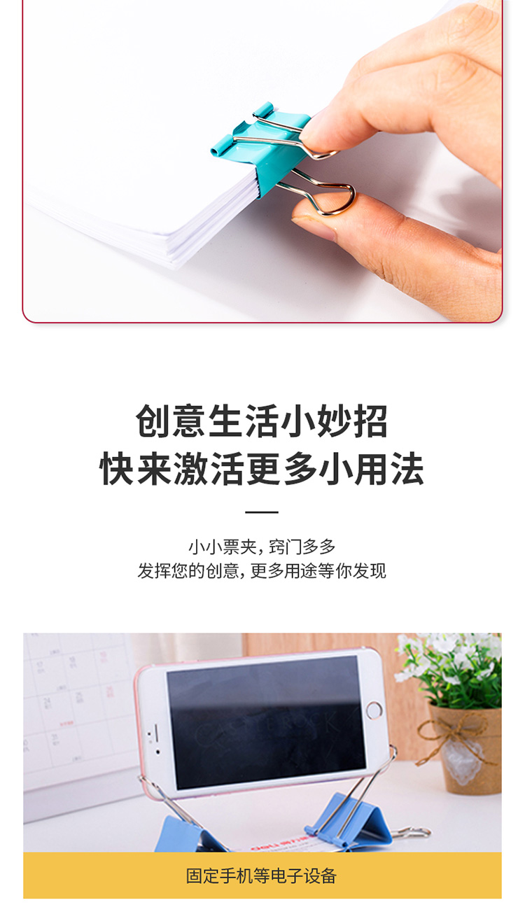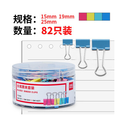 商品名稱:得力(deli)82只組合裝彩色長(zhǎng)尾夾/燕尾夾/票夾(25mm*12只+19mm*25只+15mm*45只) 辦公用品 8521