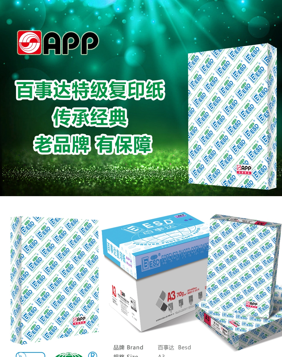 商品名稱:金光(APP)藍色百事達(Besd)A3/70g 復(fù)印紙 500張/包 5包/箱(2500張)