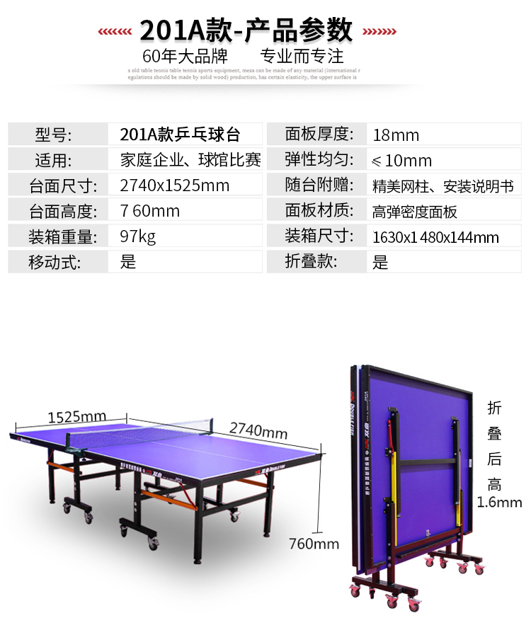 商品名稱:雙魚室內(nèi)可折疊移動標(biāo)準(zhǔn)乒乓球桌 201A球臺藍色