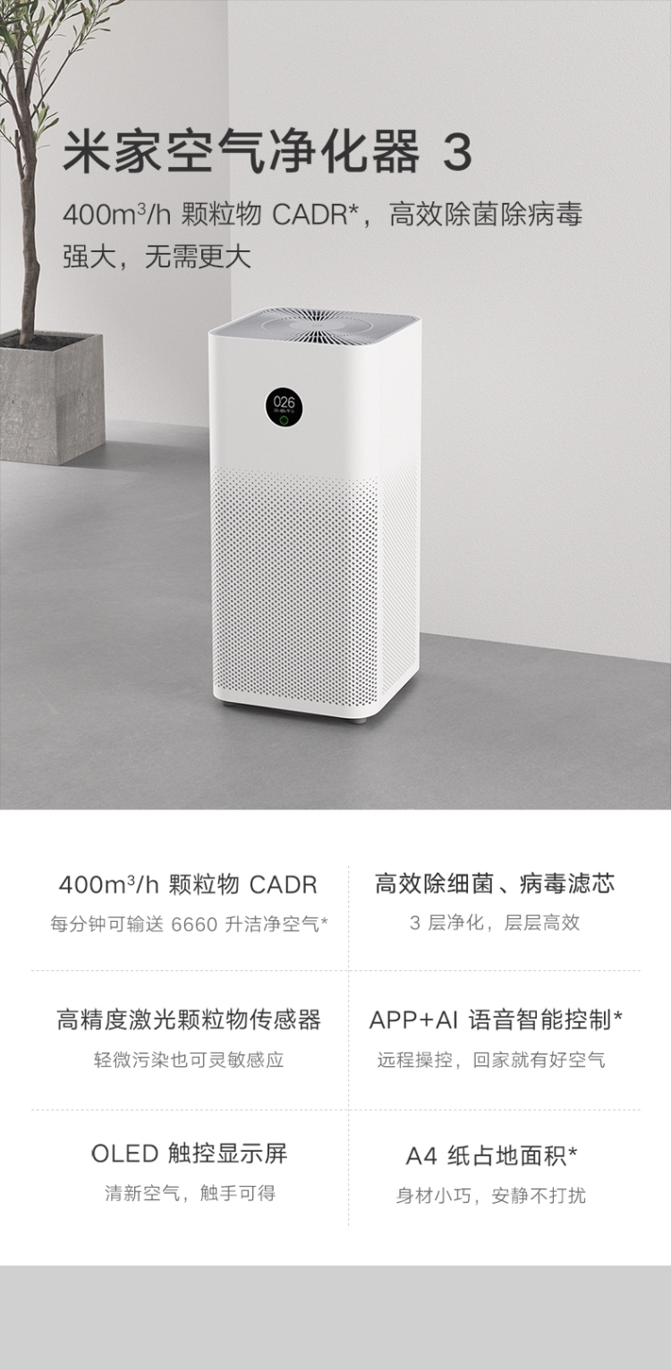 自營(yíng)小米(MI)AC-M6-SC 米家空氣凈化器3 400m3/h